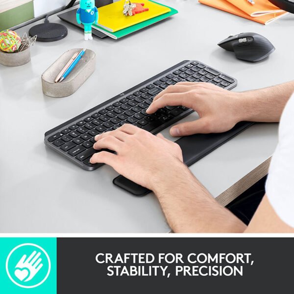 Built for creatives, coders, and professionals, the MX Keys Plus features smart backlit keys, a comfortable palm rest, and multi-device wireless connectivity via Bluetooth or USB receiver. The keys are spherically dished to match your fingertips for a fast, fluid, and quiet typing experience.